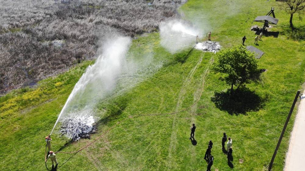 Tatbikatın ilk bölümünde orman ve kırsal alan yangınlarına hazırlık, kişisel koruyucu donanım, haberleşme, orman yangınlarına müdahale tedbirleri, yangın araç gereç malzemeleri ve ekipmanları anlatıldı. Tatbikatın ikinci bölümünde ise Poyrazlar Gölü Mesire alanında arazözlerle bölgeye giden ekipler alevlere müdahale etti. (DHA)
